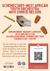 The Schenectady/West African Youth Orchestra with Zorkie Nelson performs a repertoire of both composed and traditional musics using traditional West African instruments (drums, bells, gourd xylophone, bamboo flutes). It was formed and Initiated by Ghanaian master drummer, Zorkie Nelson, who provides teaching materials, instruments, repertoire, and coaching. The Schenectady/West African Youth Orchestra with Zorkie Nelson was initiated through an Individual Artists’ grant from the New York State Council on the Arts. The orchestra is open to any interested school-aged members. Rehearsals are each Tuesday from 6:00 – 7:00 p.m. at the Adeline Wright Graham Clubhouse of the Boys and Girls Club. Information about the Boys and Girls Club of Schenectady, and how to participate, can be found HERE